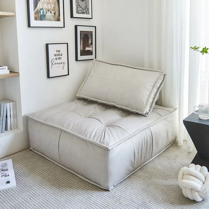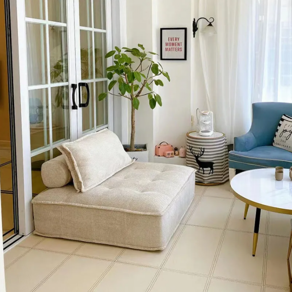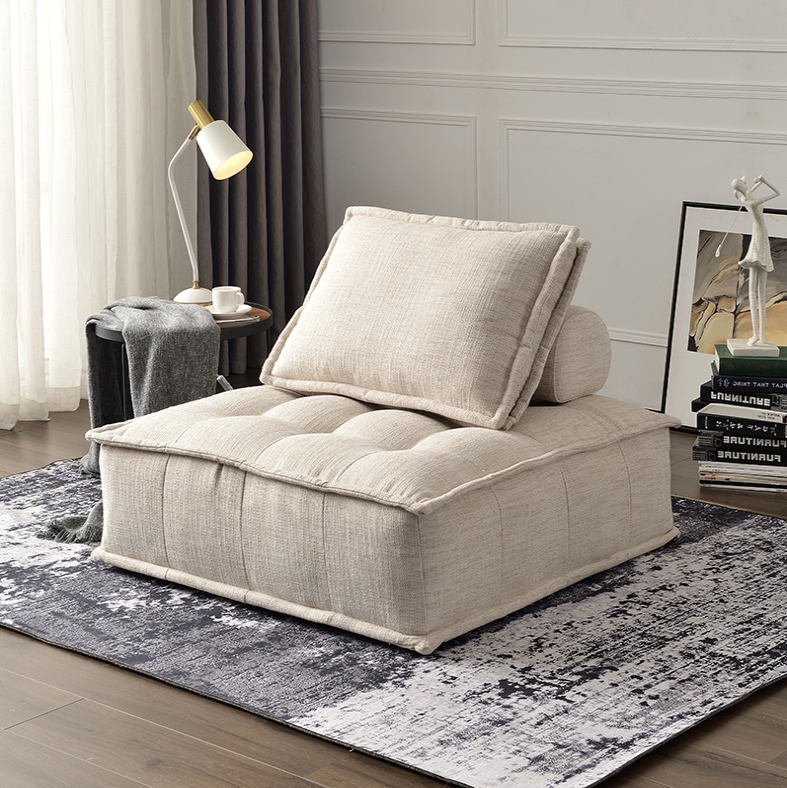 جلسة ارضية للاسترخاء بتصميم انيق وحديث باللون الرمادي الفاتح ومصنوع من القماش عالي الجودة والخشب الصلب. تأتي جلسة استرخاء بمقاس 36 سم ارتفاعاً، 85سم عمقاً، و 85سم عرضاً. يتميز بتصميم فريد من نوعه يناسب الأذواق الحديثة.