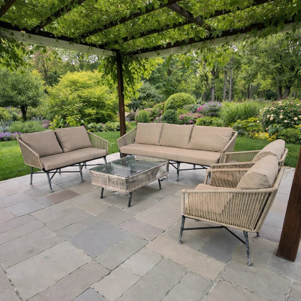 جلسة خارجية أنيقة مصممة لتوفير أقصى درجات الراحة والاستمتاع في الحدائق، الشرفات، أو جلسات الفناء. تتميز بهيكل متين يتحمل الاستخدام الخارجي، مع مقاعد مبطنة بوسائد مريحة تمنح تجربة جلوس مثالية لفترات طويلة. تصميمها العصري بألوان هادئة ينسجم مع الطبيعة المحيطة ويضفي لمسة فخامة راقية، لتكون الخيار الأمثل للاسترخاء واستقبال الضيوف في أجواء مفتوحة ومريحة.