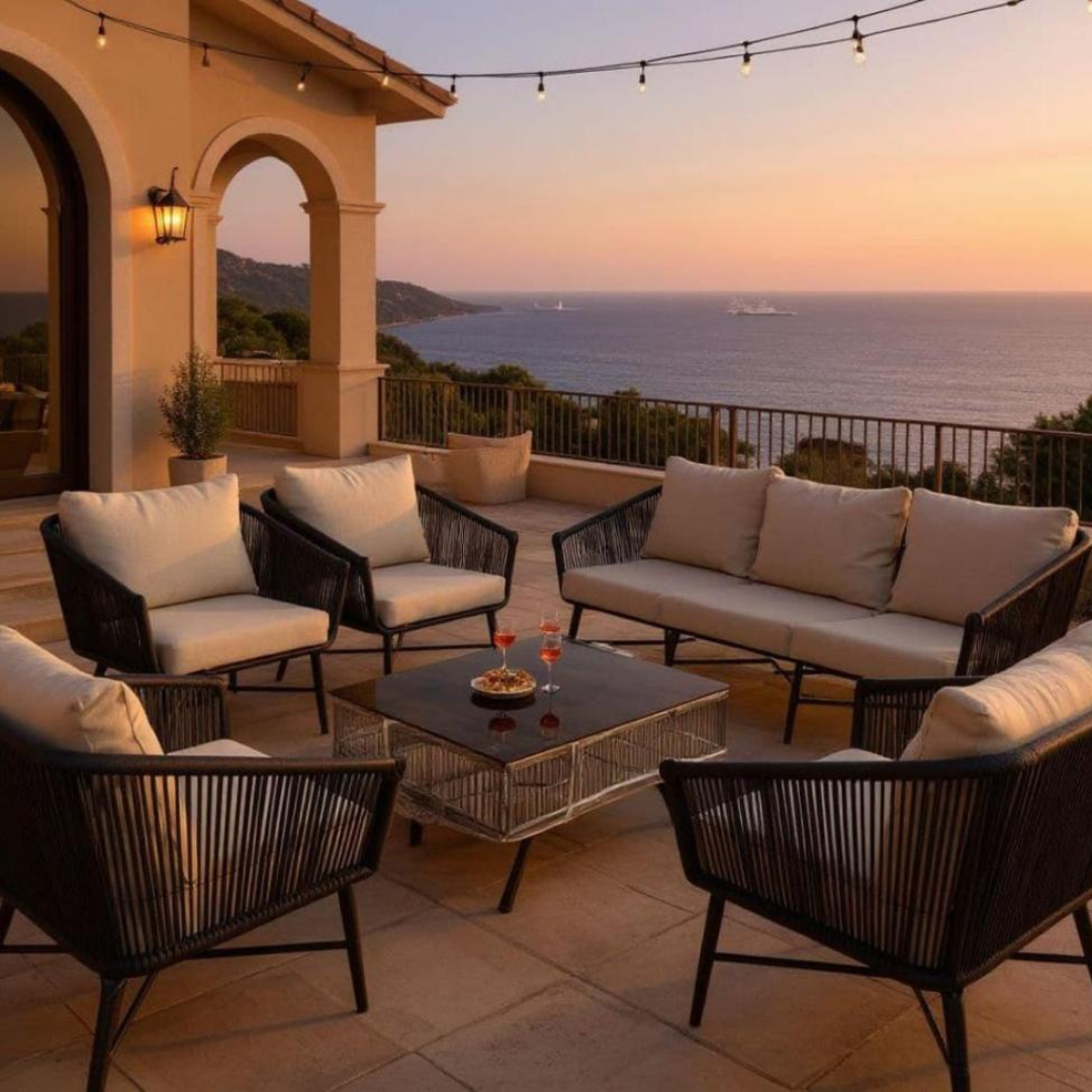 جلسة خارجية بتصميم عصري يجمع بين الفخامة والراحة، مصنوعة بهيكل معدني متين مع حبال منسوجة تضيف لمسة راقية. الوسائد السميكة المريحة تمنحك تجربة جلوس مثالية، ومقاومة للاستخدام الخارجي. قطعة متكاملة مثالية للتراسات والحدائق، لتحويل أي مساحة خارجية إلى مكان راقٍ للاسترخاء والاستمتاع.