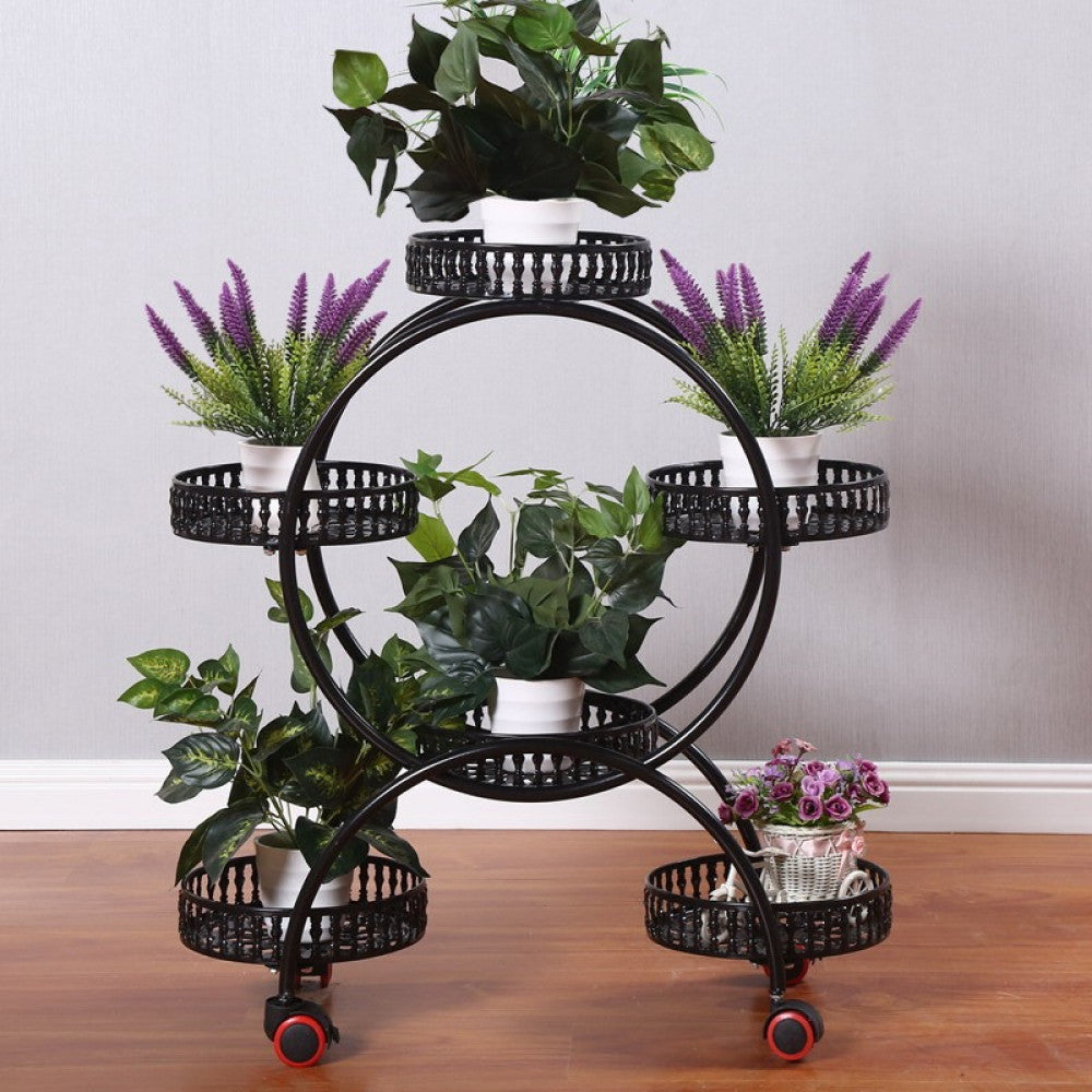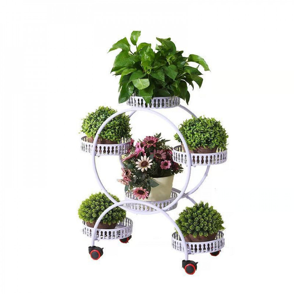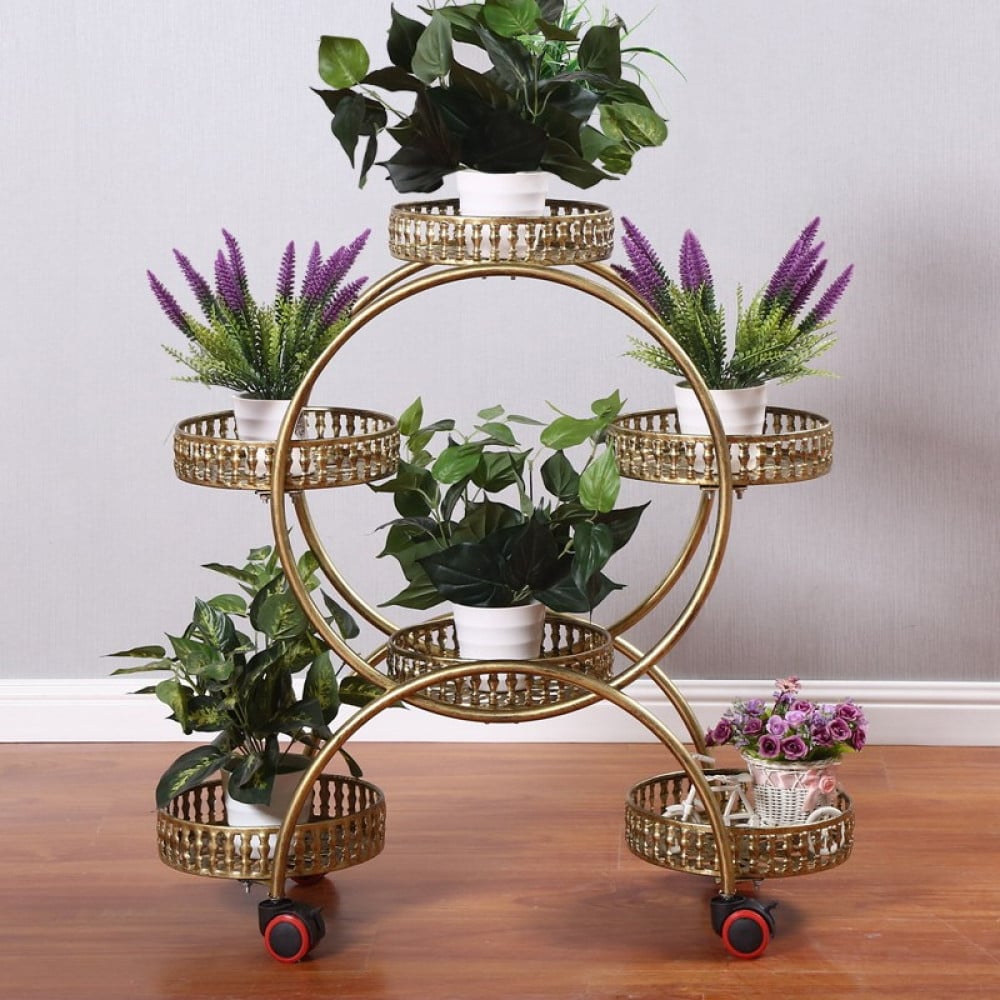 حامل زهور بشكل دائري مميز يحتوي علي عجلات لسهوله تنقله و هو مصنوع بالكامل من هيكل معدني مقاوم للصدأ ف هو تميز بتصميمه العصري و المميز و جودته خاماته و هو متوفر ب اللون ( الأبيض - الذهبي - الأسود )
