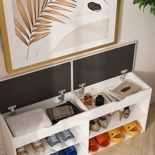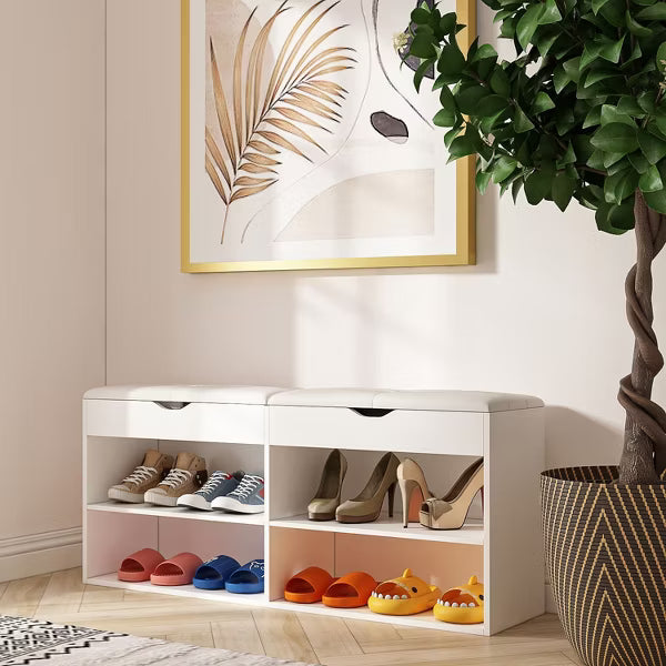 امنح مدخلك لمسة من الأناقة والعملية مع وحدة تخزين الأحذية المبتكرة هذه. تتميز بتصميم عصري باللون الأبيض النظيف، يجمع بذكاء بين مكان لتنظيم الأحذية ومقعد مريح للجلوس. الجزء العلوي مزود بمقعد، مما يوفر لك ولضيوفك مكاناً مريحاً لارتداء وخلع الأحذية. الجزء السفلي يوفر أرفف مفتوحة وواسعة ، مثالية لترتيب الأحذية بشكل منظم وسهل الوصول إليه. هذه القطعة ليست مجرد حل عملي للتخزين، بل هي إضافة ترحيبية ترفع من مستوى تنظيم وجمالية المدخل، لأنها تجمع بين مقعد الجلوس والتخزين المنظم في تصميم واحد مدمج وأنيق