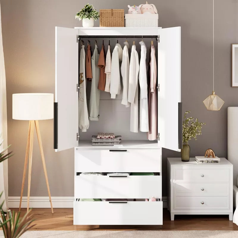 اجعل غرفتك أكثر ترتيبًا وأناقة مع دولاب الملابس العملي هذا، المصمم ليجمع بين التخزين الذكي والتصميم الجذاب في قطعة واحدة. يوفر لك هذا الدولاب مساحة تخزين متكاملة تشمل جزءًا علويًا واسعًا مزودًا ببابين خشبيين أنيقين بتصميم مميز ومجهز بعلاقة داخلية لتعليق ملابسك للحفاظ عليها مكوية ومنظمة، بالإضافة إلى ثلاثة أدراج سفلية فسيحة ومزودة بمقابض سوداء أنيقة، مثالية لتخزين الملابس المطوية، اللوازم الشخصية، أو الإكسسوارات. تصميمه العصري بخطوطه النظيفة يجعله إضافة مثالية لأي غرفة نوم، مدخل، أو مساحة تخزين إضافية، وهو متوفر بألوان تناسب كل ذوق وديكور: الأبيض الناصع، الأسود الأنيق، أو الخشبي الدافئ. ودّع الفوضى واستقبل الأناقة والتنظيم الكامل مع دولاب الملابس هذا، الذي يعد استثمارًا ذكيًا لغرفة مرتبة ومنظمة دائمًا