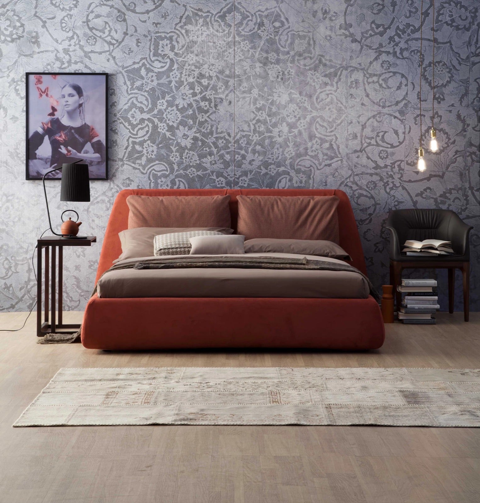 يتميز السرير بواجهة مبطّنة تمنحك راحة فائقة، مع هيكل هندسي متوازن يضيف جمالاً بصريًا ويجعل القطعة تبدو أكثر حضورًا وأناقة. خامته المختارة بعناية تضيف ملمسًا غنيًا وتمنح الغرفة طابعًا دافئًا ومناسبًا لكل المواسم.