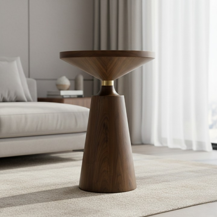 طاولة جانبية بتصميم فاخر يجمع بين البساطة العصرية واللمسة الفنية، تأتي بقاعدة مخروطية ثابتة وسطح علوي أنيق يتصل بتفصيل معدني ذهبي يمنحها مظهرًا راقيًا.