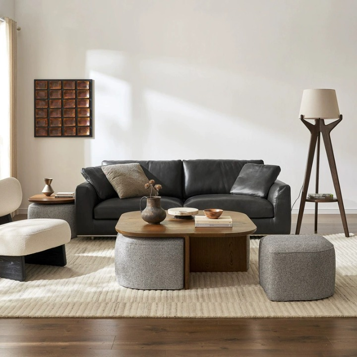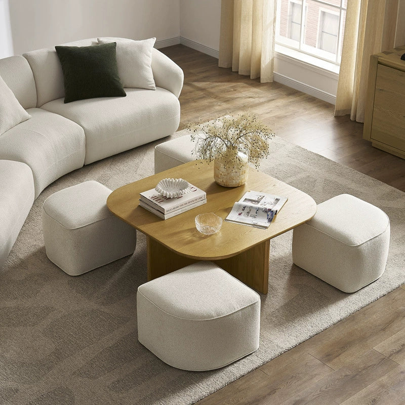 اكتشف قمة الأناقة العصرية والوظائف المتعددة مع طقم طاولة القهوة و الأوتومان هذا، المصمم خصيصًا ليصبح محور غرفة معيشتك. يتألف الطقم من طاولة قهوة خشبية جذابة ذات سطح مربع بأركان منحنية ناعمة، بألوان ناعمه تضفي دفئًا وإشراقًا على المكان. تكمل الطاولة أربع 4 بوف أنيقة ومريحة، مغطاة بقماش ناعم ، يمكن وضعها بذكاء تحت الطاولة أو حولها لتوفير مقاعد إضافية عند الحاجة، أو استخدامها كمساند قدم مريحة، مما يجعلها مثالية للضيوف أو للاسترخاء اليومي. هذا الطقم المتكامل لا يوفر لك مساحة مركزية أنيقة لتقديم الضيافة والديكور فحسب، بل يمنحك أيضًا حلول جلوس وتخزين مرنة تضفي لمسة من التنظيم والرقي على منزلك العصري