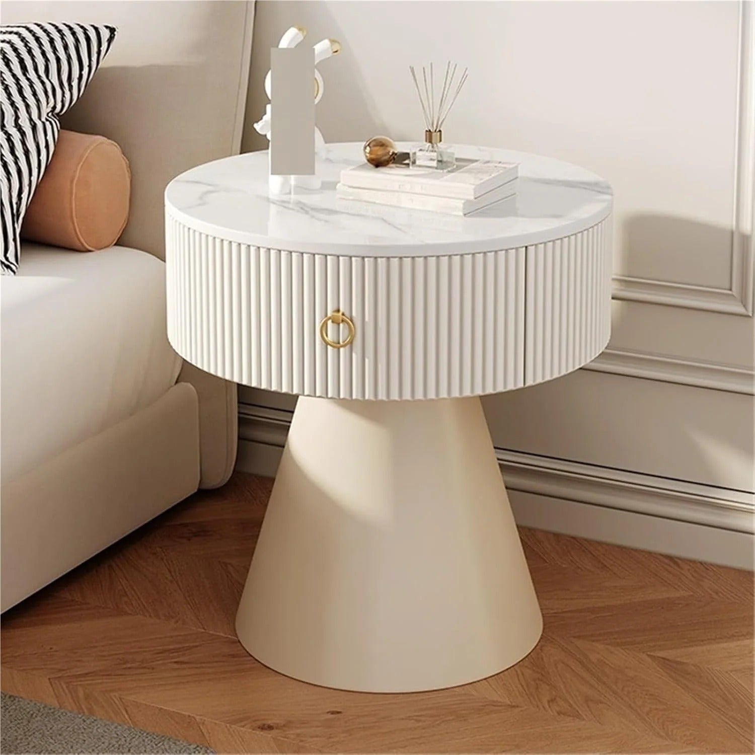 طاولة جانبية بتصميم عصري أنيق تجمع بين الفخامة والوظيفة، بسطح رخامي أنيق وقاعدة مخروطية متينة تضيف لمسة راقية لأي مساحة. مزودة بدرج عملي لتخزين الأشياء الصغيرة، مما يجعلها مثالية بجانب السرير أو الأريكة لإكمال ديكورك بذوق راقٍ ولمسة من الفخامة الحديثة.