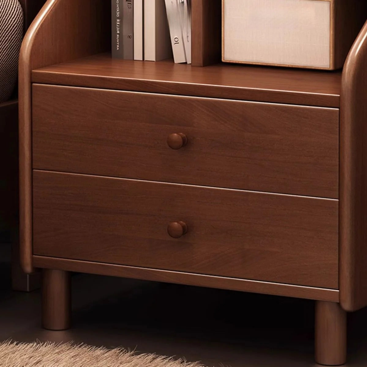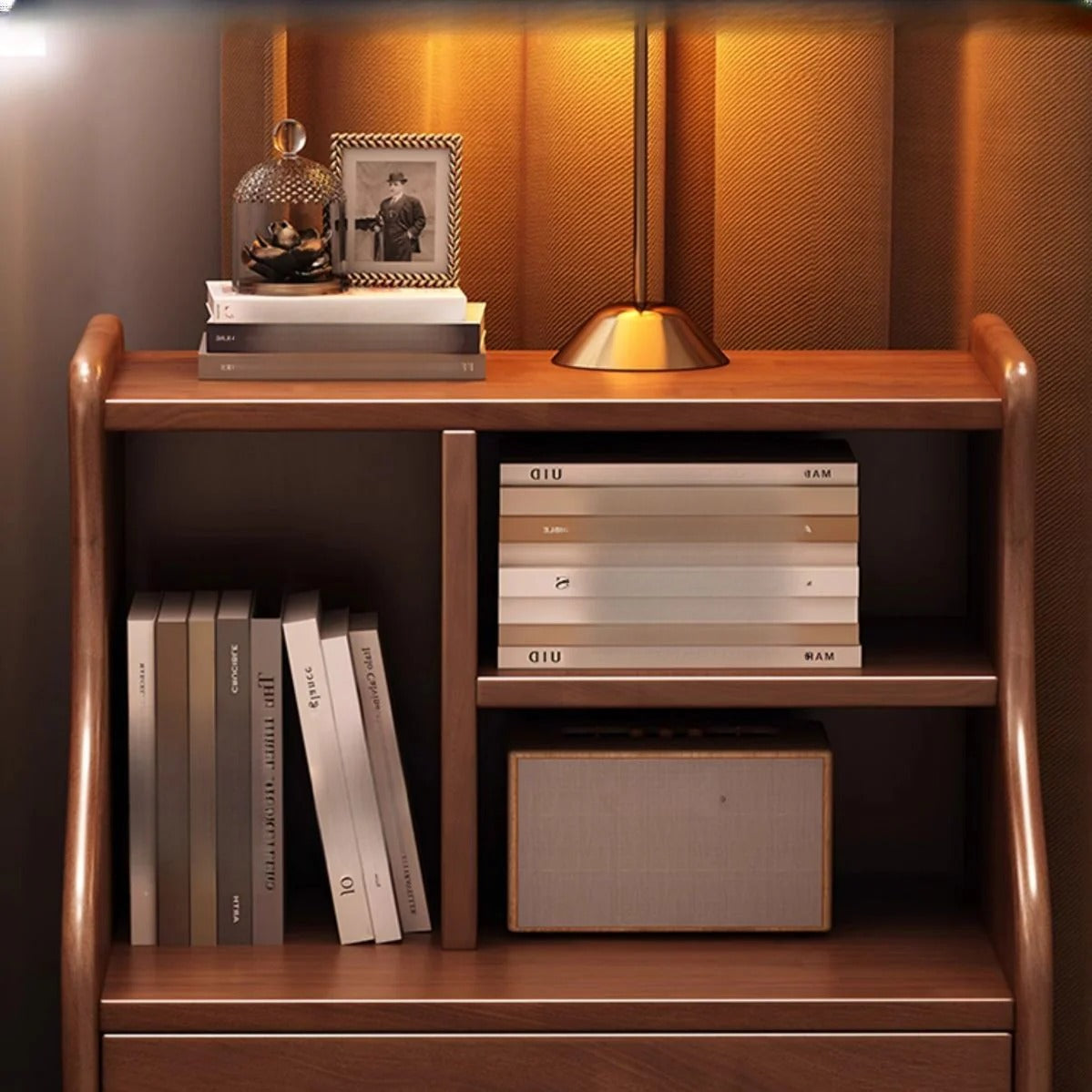 طاولة جانبية خشبية بتصميم كلاسيكي أنيق يجمع بين العملية والجمال، تحتوي على رفوف مفتوحة لعرض الكتب أو الديكورات ودرجين سفليين لتخزين الأغراض بشكل منظم. قطعة مثالية بجانب السرير أو في غرفة المعيشة لإضفاء لمسة دافئة وتنظيم أنيق للمساحة.