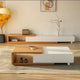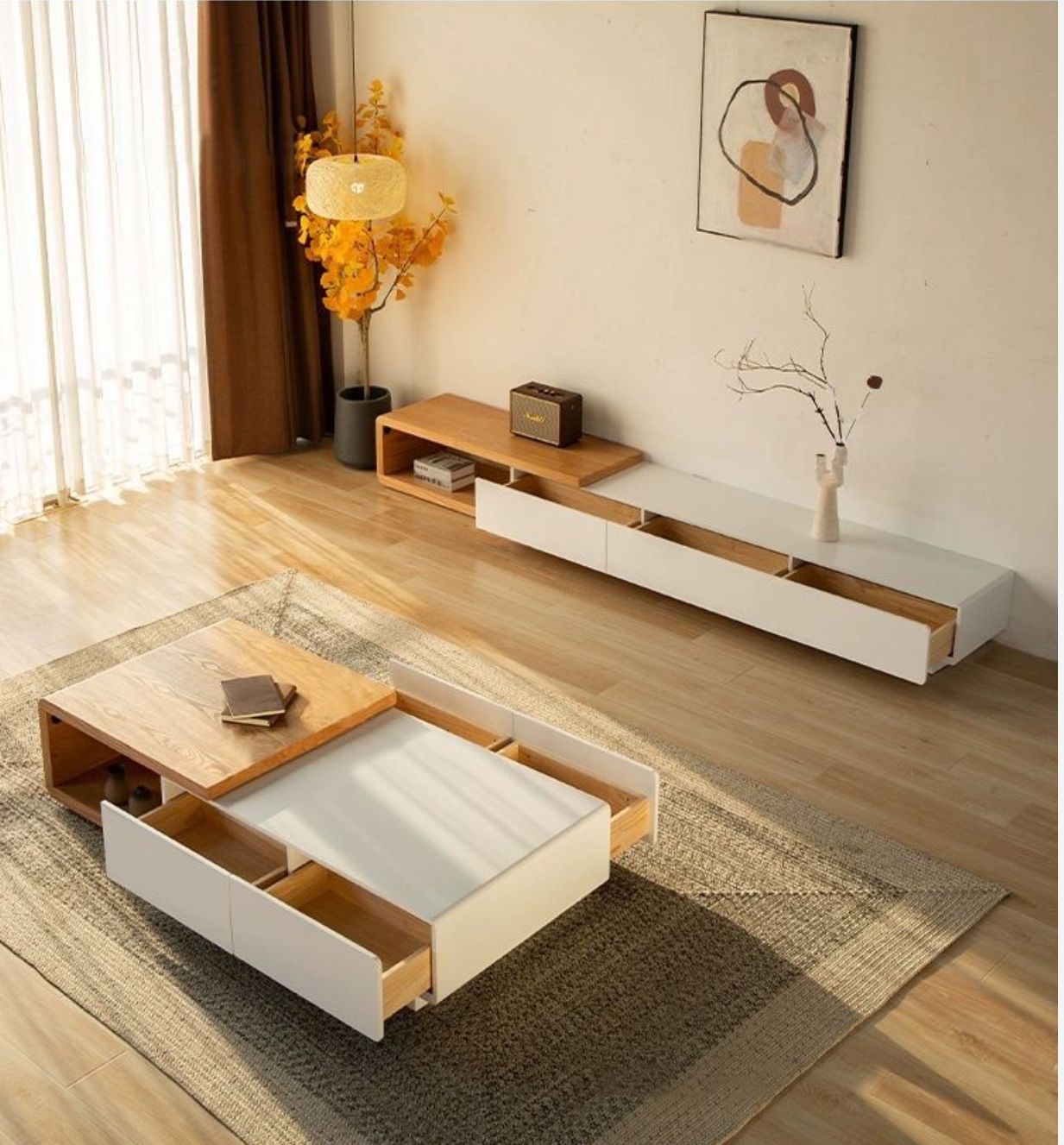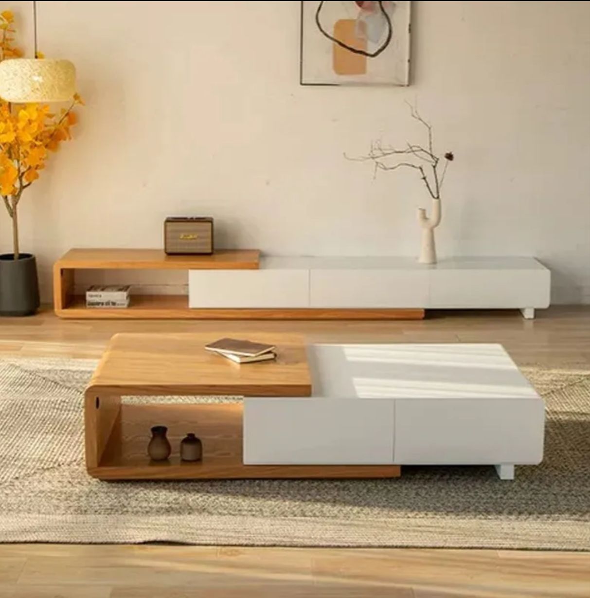ارتقِ بأناقة غرفة المعيشة مع طقم الطاولات الذكي والمودرن المصمم ليوفر لك جمال التصميم وسهولة الاستخدام في آنٍ واحد. يتكون من طاولة قهوة ووحدة تلفاز بلمسات خشبية دافئة وانسيابية مع واجهات بيضاء ناعمة تضيف لمسة من النقاء والبساطة. الطاولة تأتي مزودة بعدة أدراج جانبية توفر مساحة تخزينية عملية للحفاظ على تنظيم مثالي، بينما تتيح وحدة التلفاز الطويلة تخزين الأجهزة والإكسسوارات بأسلوب راقٍ ومرتب