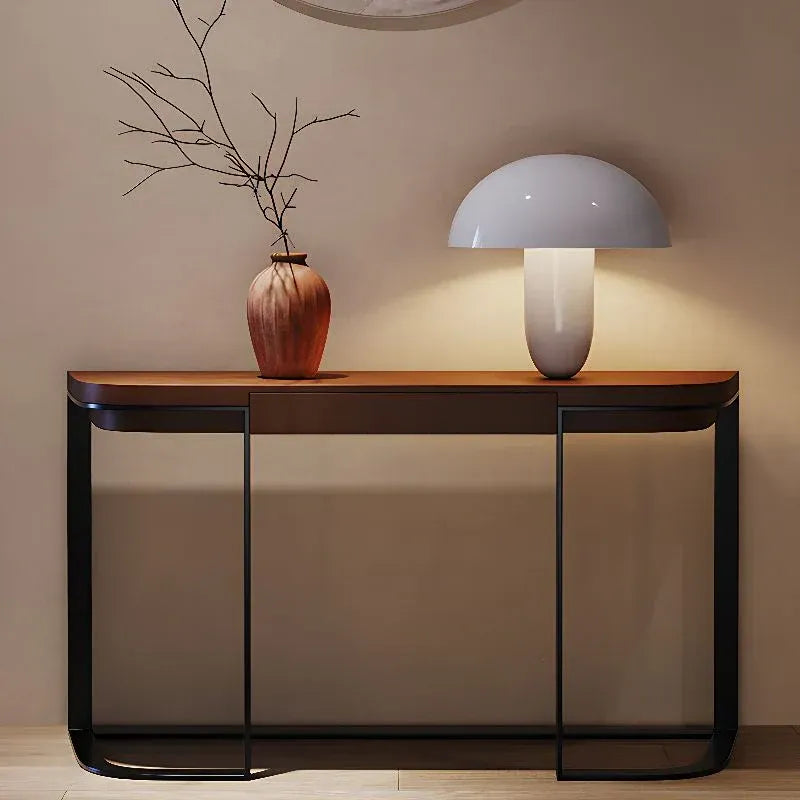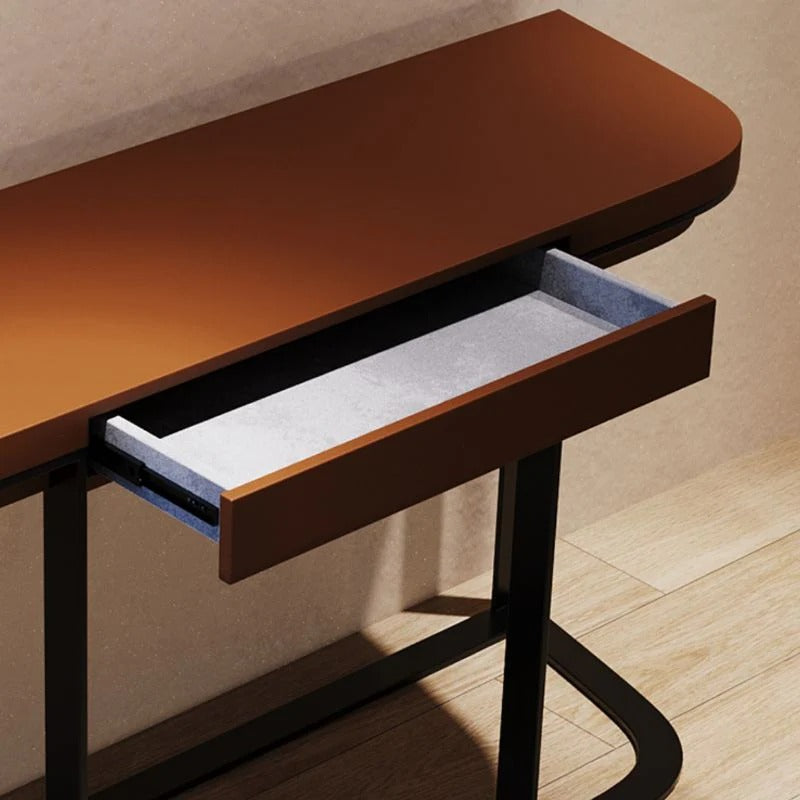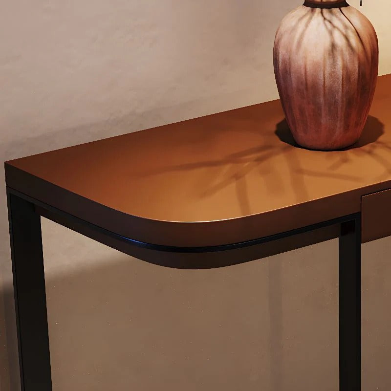 كونسول بتصميم عصري أنيق يجمع بين الفخامة والبساطة، بسطح باللون البني الدافئ وهيكل معدني أسود يمنحه مظهراً متوازناً ومتيناً. يتميز بحوافه المنحنية التي تضيف لمسة انسيابية راقية، مما يجعله مثالياً لتزيين الممرات أو غرف المعيشة، مع إمكانية استخدام سطحه لعرض التحف أو الإضاءة لإبراز جمال المساحة.