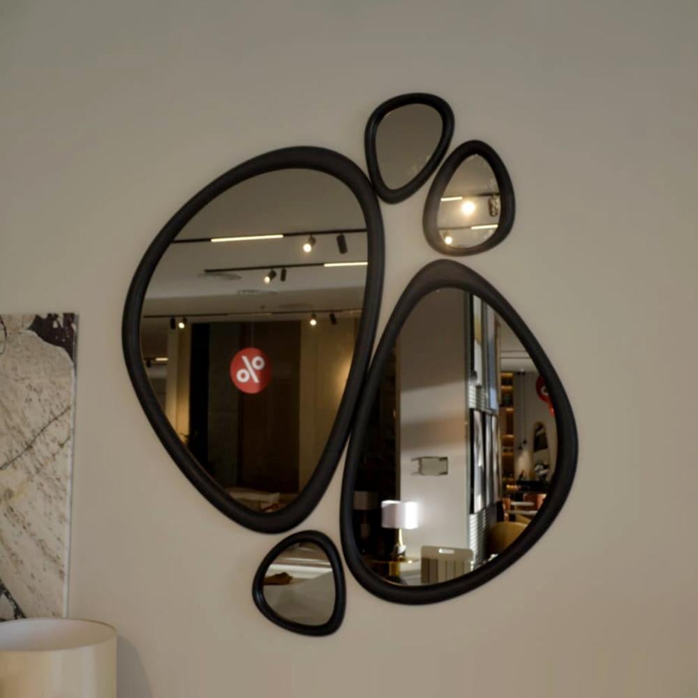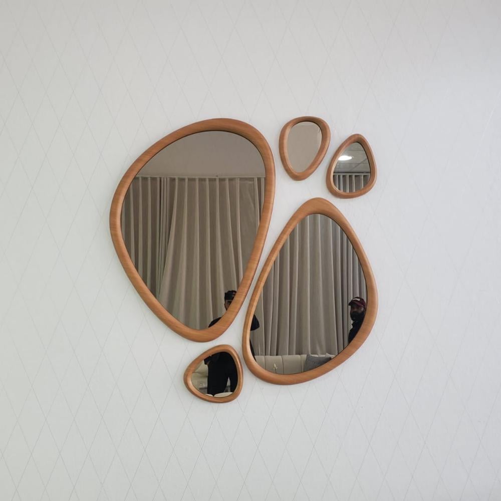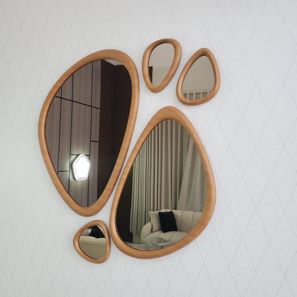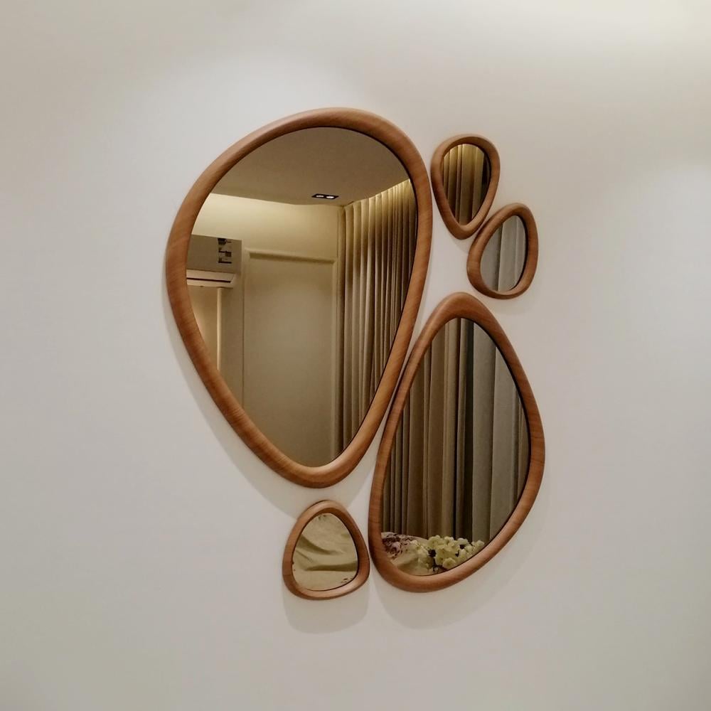 مرآة جدارية متصلة بتصميم فريد تجمع بين الأناقة والابتكار، بإطار خشبي طبيعي يضفي دفئًا وحيوية على المساحة، وأشكال انسيابية مستوحاة من الطبيعة تعكس الضوء وتمنح الغرفة شعورًا بالاتساع والرحابة، مما يجعلها قطعة فنية عملية تضيف لمسة عصرية راقية لأي جدار في منزلك