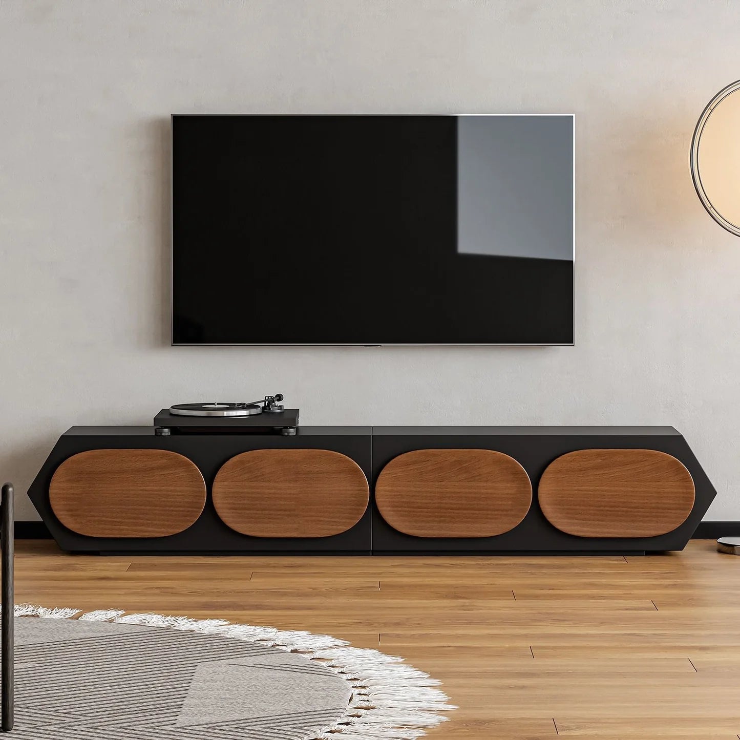 وحدة تلفزيون مودرن بتصميم هندسي أنيق يجمع بين الخشب الطبيعي واللون الداكن ليمنح المكان لمسة فخامة هادئة. قطعة واحدة عملية توفّر مساحة تخزين منظمة خلف أبواب انسيابية، وتضيف لمسة ديكور راقية تناسب غرفة المعيشة أو المكتب. تجمع بين الجمال والمتانة، وتمنحك مظهراً عصرياً يكمّل أي مساحة بسهولة