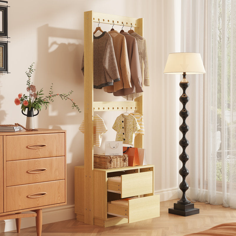 اكتشف الكفاءة والجمال الطبيعي مع وحدة التخزين الخشبية هذه، المصممة خصيصاً لتحقيق أقصى استفادة من المساحات الرأسية. تتميز بتصميم بلون الخشب الفاتح والمشرق، مما يضيف لمسة دافئة وعصرية لديكور منزلك. توفر الوحدة حلاً شاملاً لتنظيم الملابس، حيث تحتوي على علاقات علوية و سفلية مثالية لتعليق المعاطف، القمصان، الحقائب أو الإكسسوارات. الجزء السفلي مزود بدرجين فسيحين يوفران مساحة تخزين مغلقة ومثالية للأحذية، ، أو الأغراض الشخصية. إنها قطعة مثالية للمداخل، غرف النوم، أو حتى الغرف ذات المساحة المحدودة، تجمع بين التعليق المفتوح والتخزين المغلق بذكاء وأناقة لا مثيل لها.